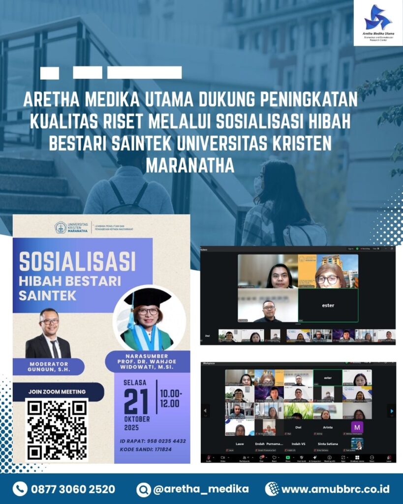 Bandung, 21 Oktober 2025 — PT Aretha Medika Utama berperan sebagai mitra dalam kegiatan Sosialisasi Hibah Bestari Saintek yang diselenggarakan oleh Universitas Kristen Maranatha. Kegiatan yang berlangsung secara daring melalui Zoom Meeting pada pukul 10.00–12.00 WIB ini menjadi forum strategis dalam memperkuat sinergi antara lembaga pendidikan tinggi dan mitra penelitian di bidang sains dan teknologi.