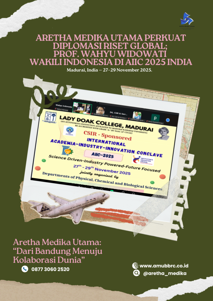 Madurai, India — 27–29 November 2025. PT Aretha Medika Utama kembali menunjukkan perannya sebagai institusi riset biomedis Indonesia yang aktif di tingkat internasional. Melalui partisipasinya dalam International Academia–Industry–Innovation Conclave (AIIC 2025), Aretha memperkuat diplomasi riset global dengan menghadirkan Prof. Dr. Wahyu Widowati, M.Si sebagai delegasi ilmiah yang mewakili Indonesia. Prof. Wahyu hadir dengan kapasitas ganda sebagai Dosen Fakultas Kedokteran Universitas Kristen Maranatha dan Tenaga Ahli PT Aretha Medika Utama.