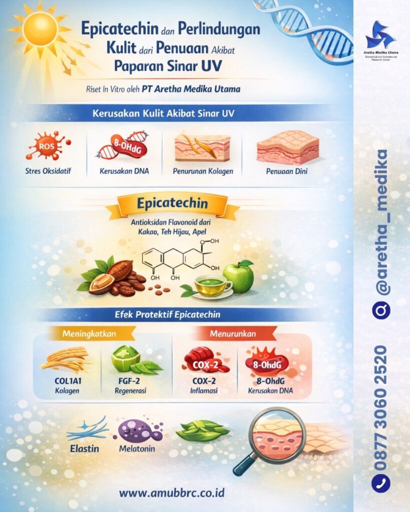 Temuan ini menunjukkan bahwa epicatechin tidak hanya berfungsi sebagai penangkap radikal bebas, tetapi juga sebagai regulator jalur molekuler penting yang terlibat dalam penuaan kulit. Pendekatan ilmiah ini sejalan dengan komitmen PT Aretha Medika Utama dalam mengembangkan inovasi berbasis riset biomolekuler yang kuat, menjembatani temuan laboratorium dengan potensi aplikasi di bidang kesehatan kulit, farmasi, dan bioteknologi.