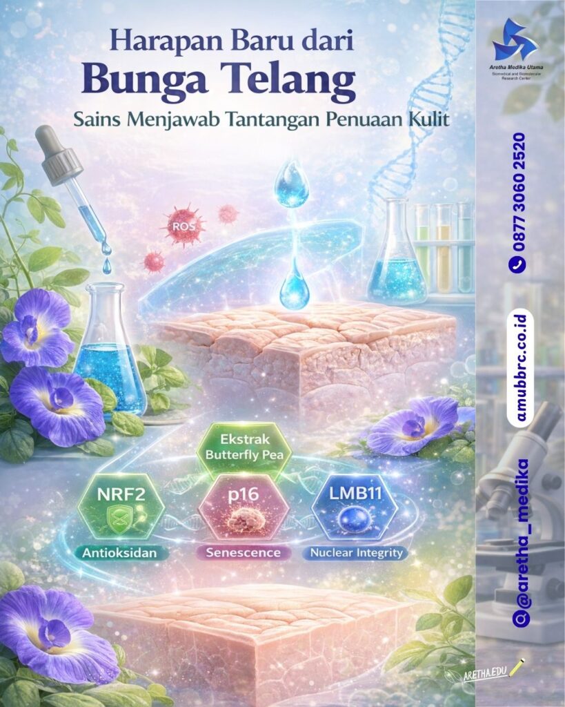 Bunga telang kaya akan antosianin, flavonoid, dan ternatin, senyawa aktif yang dikenal memiliki aktivitas antioksidan kuat. Namun, penelitian sebelumnya sebagian besar hanya menilai kemampuannya menurunkan ROS atau meningkatkan viabilitas sel. Belum banyak yang melihat pengaruhnya langsung terhadap jalur genetik anti-aging seperti NRF2, p16, dan LMNB1 secara bersamaan pada fibroblast dermal primer manusia Di sinilah letak kebaruan penelitian ini.