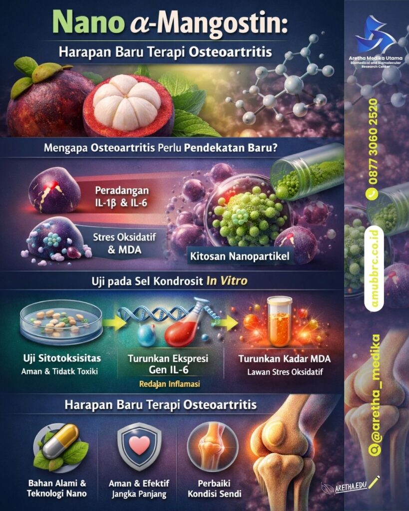 Melalui riset eksperimental berbasis kultur sel, penelitian yang dilakukan di Laboratorium Sel Kultur PT Aretha Medika Utama mengembangkan Nano α-Mangostin sebagai kandidat inovatif berbasis bahan alam untuk penanganan osteoartritis .