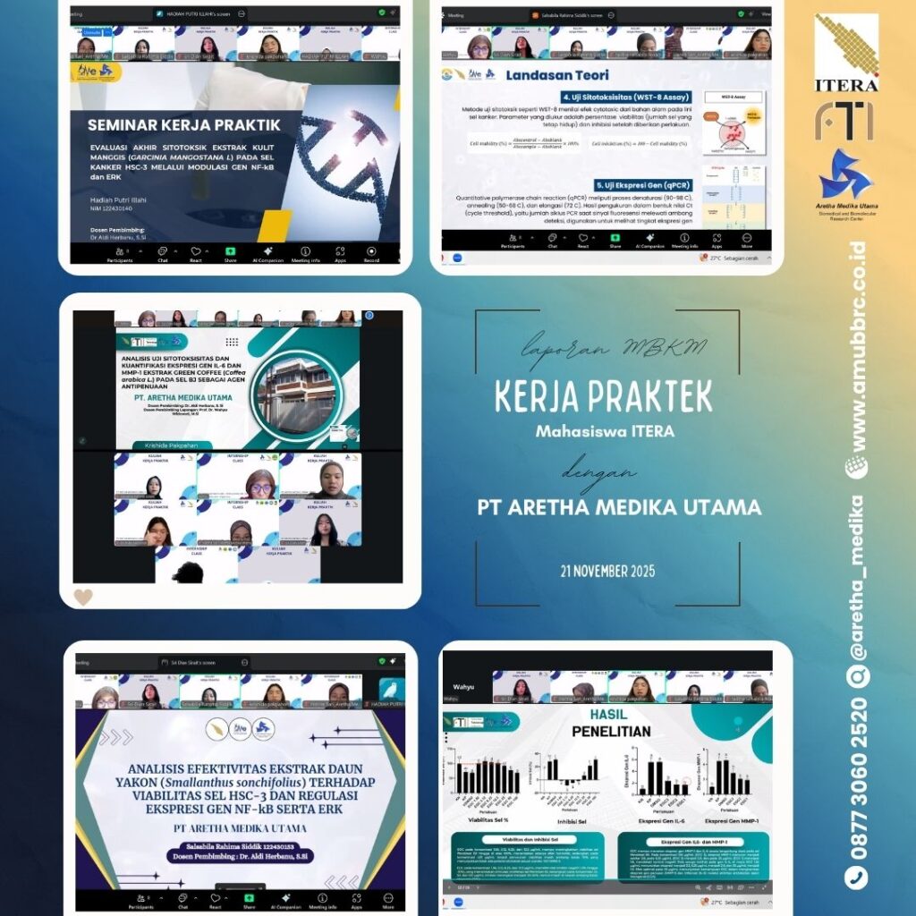 Bandung, 21 November 2025 — Program Merdeka Belajar Kampus Merdeka (MBKM) yang dijalankan mahasiswa Institut Teknologi Sumatera (ITERA) di PT Aretha Medika Utama, memasuki tahap akhir dengan penyampaian laporan hasil kegiatan. Acara yang berlangsung pada Jumat, 21 November 2025 ini diselenggarakan melalui Zoom Meeting dan dihadiri oleh Direktur Utama PT Aretha Medika Utama, Hanna Sariwidya, S.Si, serta Prof. Dr. Wahyu Widowati, M.Si, selaku tenaga ahli yang turut membimbing jalannya program.