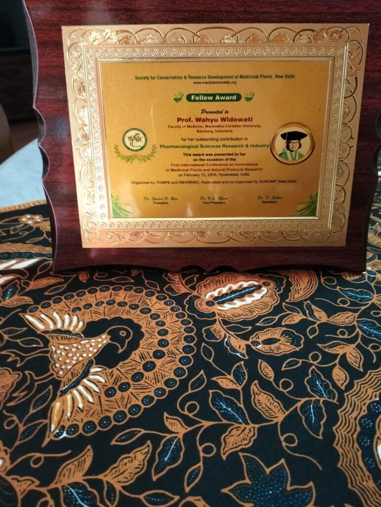 Hyderabad, India – Prestasi membanggakan kembali ditorehkan oleh akademisi Indonesia. Prof. Wahyu Widowati dari Fakultas Kedokteran, Maranatha Christian University, Bandung, dianugerahi “SCRDMP–Fellow Award 2026” oleh Society for Conservation and Resource Development of Medicinal Plants (SCRDMP), New Delhi.