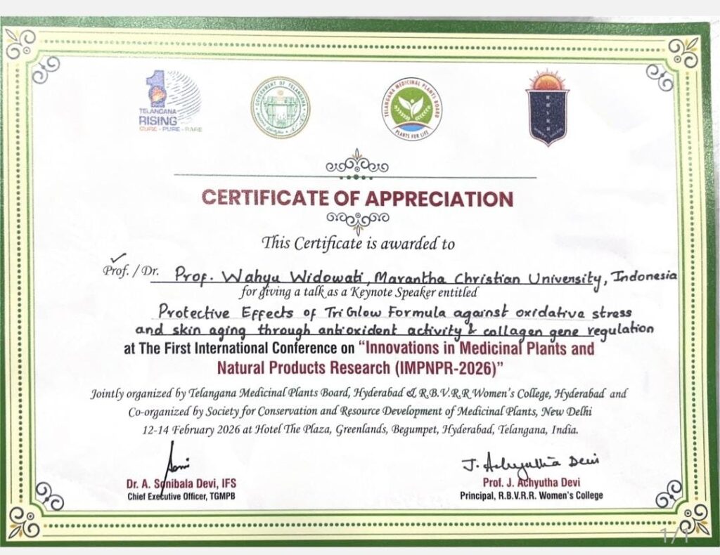 Hyderabad, India – Prof. Wahyu Widowati, M.Si., dari Fakultas Kedokteran Universitas Kristen Maranatha, Bandung, tampil sebagai Keynote Speaker dalam The First International Conference on Innovations in Medicinal Plants and Natural Products Research (IMPNPR) yang diselenggarakan pada 12–14 Februari 2026 di Hyderabad, India.