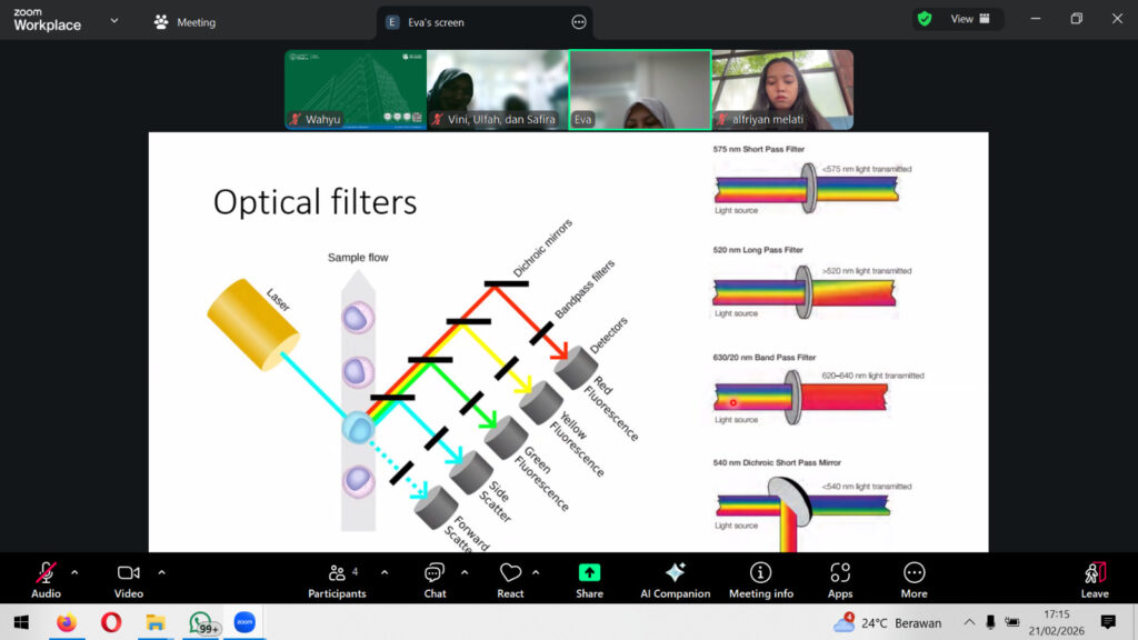 Selain itu, peserta juga mempelajari peran optical filters, yaitu komponen yang berfungsi untuk memisahkan sinyal cahaya berdasarkan panjang gelombangnya. Filter ini memastikan bahwa setiap sinyal fluoresen dapat dideteksi secara spesifik tanpa gangguan dari sinyal lainnya, sehingga menghasilkan data yang valid dan dapat diandalkan dalam kegiatan penelitian.